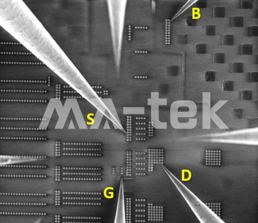 在去层到底层后,有时还找不到缺陷,担心继续下去看不到失效点,平白浪费一个样品吗?那么使用nano-probe 直接量测元件的电性行为,确认漏电路径后便可轻松拟定后续的PFA 步骤。Nano-probe 在SRAM cell 的量测也是不可或缺的工具,虽说直接以plan-view TEM 查找缺陷是个快捷的路径,但以闳康科技在FinFET SRAM 分析将近百颗的经验,有不少的案例是PV TEM 不易看出的,此时借助nano-probe 电性的量测才能判断出异常的位置,进而做出正确截面位置的选择。